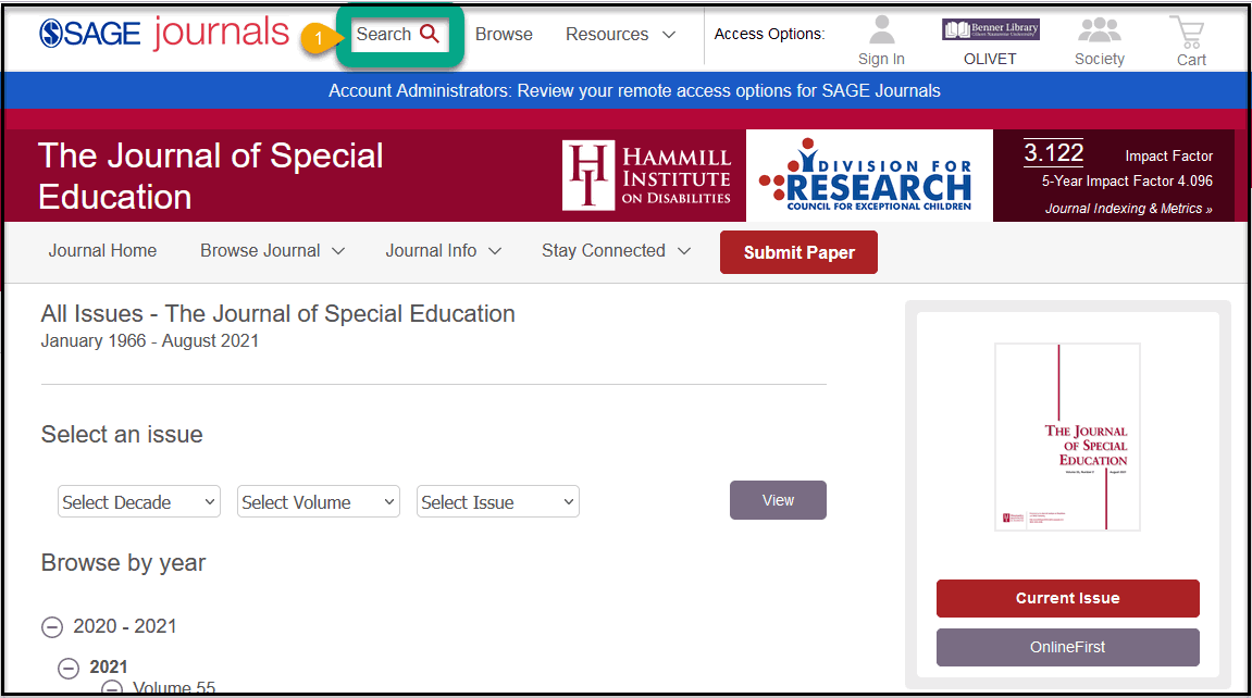 For Journal of Special Education: Click on “Search” option at top of page. Then, in order to limit by date, click on “Advanced Search. Our full text subscription begins with 1966."